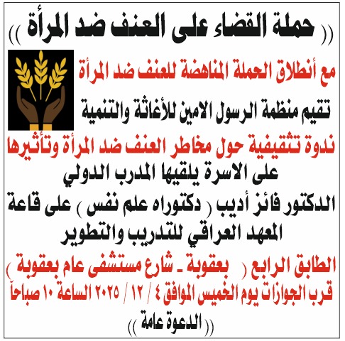 اقامت منظمة الرسول الامين ندوة تثقيفية حول مخاطر العنف ضد المرأة وذلك ضمن حملة ال (16) يوما من النشاط لمناهضة العنف القائم على النوع الاجتماعي, وهي مبادرة دولية تطلقها الامم المتحدة من 25 نوفمبر (اليوم العالمي للقضاء على العنف ضد المرأة) الى 10 ديسمبر (يوم حقوق الانسان). هدفت الندوة التي القاها الدكتور فائز أديب (دكتوراه علم النفس) الى رفع الوعي وتعبئة الجهود المجتمعية والقانونية لمناهضة جميع انواع العنف ضد النساء والفتيات بجميع الا عمار. حضر الندوة نخبة من مثقفي المجتمع من اساتذة ومعلمين ورؤساء منظمات انسانية اضافة الى مجموعة من ضباط الشرطة المجتمعية. حيث تم مناقشة اهم اسباب العنف ضد المرأة وطرق القضاء عليها عن طريق رفع الوعي الثقافي لجميع افراد المجتمع.